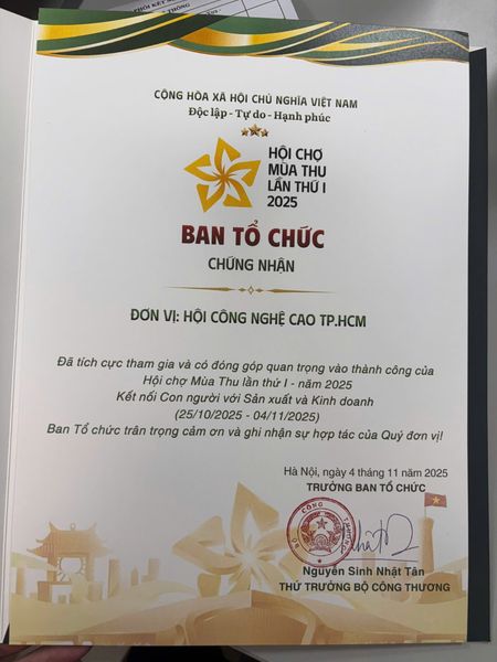 Hội Công nghệ cao TP.HCM (Hội CNC) vinh dự được Bộ Công Thương ghi nhận và chứng nhận có đóng góp tích cực trong khuôn khổ Hội chợ Mùa Thu lần I năm 2025, thông qua việc giới thiệu và triển khai Hệ thống Tick Xanh Trách Nhiệm – mô hình kiểm soát chất lượng hàng hóa dựa trên minh bạch, truy xuất nguồn gốc và trách nhiệm chuỗi cung ứng.